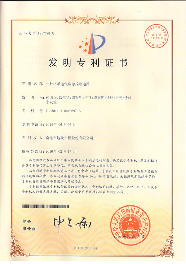 【另 訊】:由第五工程公司2014年6月申報的《一種塔吊電氣應急控制電路》,于2016年2月17日獲得國家知識產(chǎn)權局授權的發(fā)明專利證書。