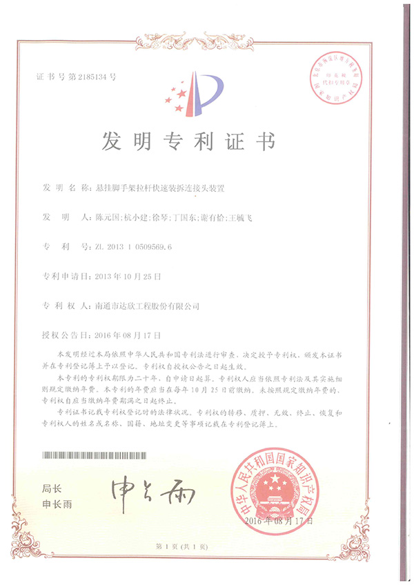 由第一工程公司申報的《懸掛腳手架拉桿快速裝拆連接頭裝置》成功獲國家知識產(chǎn)權局授權,于2016年8月17日獲得國家發(fā)明專利證書。該發(fā)明專利系工程公司《無攬風繩獨立桅桿吊裝勁性鋼柱專用夾具》后又一國家發(fā)明專利。