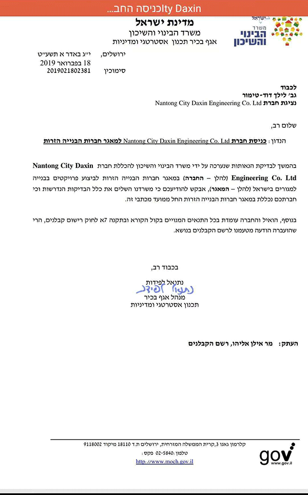 近年來,達欣集團積極響應國家“走出去”和“一帶一路”戰(zhàn)略,大力發(fā)展國際工程承包業(yè)務,此次中標以色列承包商資格,將為集團進一步拓展海外市場提供新的契機。