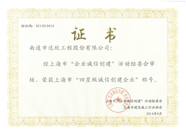 日前,由上海市建筑施工行業(yè)協(xié)會推薦,上海市“企業(yè)誠信創(chuàng)建”活動組委會審核,第三方征信機(jī)構(gòu)嚴(yán)格查證,第一工程公司在2013年榮獲“三星級誠信創(chuàng)建企業(yè)”后,今年再加一顆星,被授予上海市“四星級誠信創(chuàng)建企業(yè)”稱號。