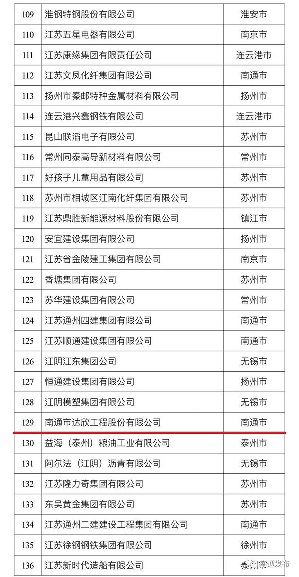9月21日,由江蘇省工商聯(lián)發(fā)布的最新民營(yíng)企業(yè)200強(qiáng)名單出爐。達(dá)欣集團(tuán)首次入圍,排位129位。本次南通民企入圍總數(shù)為32家,海安建筑企業(yè)3家。