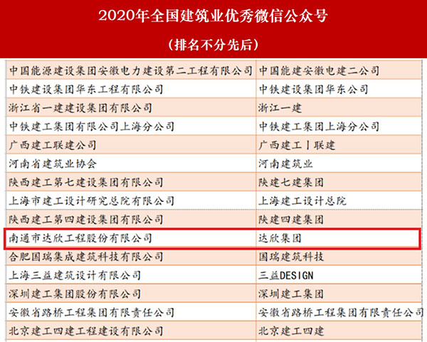 近日,由建筑時報社主辦的2020年建筑業(yè)微信公眾號運維經驗交流研討會暨2020年全國建筑業(yè)優(yōu)秀微信公眾號頒獎典禮在揚州召開。會上,公布了2020年全國建筑業(yè)“最具影響力”微信公眾號和2020年全國建筑業(yè)優(yōu)秀微信公眾號榜單。達欣集團獲得2020年全國建筑業(yè)優(yōu)秀微信公眾號。