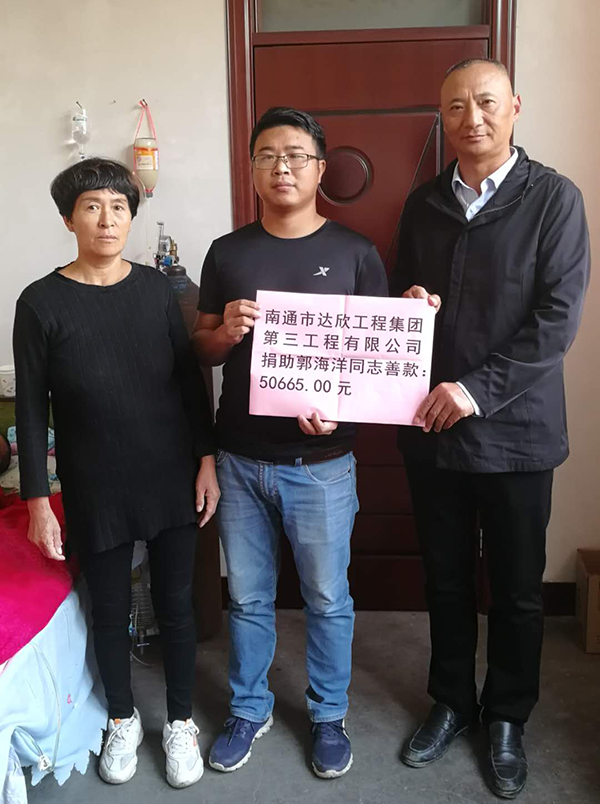 第三工程公司黨支部書(shū)記陳仁富經(jīng)常:“愛(ài)心無(wú)小事,樂(lè)善好施,扶貧幫困”是達(dá)欣人的傳統(tǒng)美德。在知曉情況后,立即發(fā)出愛(ài)心倡議。黨員們積極帶頭,全體員工紛紛伸出充滿愛(ài)心之手,將50665元善款在第一時(shí)間送到郭海洋及家人手里。