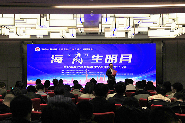 10月29日,海安市駐滬新時(shí)代文明實(shí)踐站成立儀式在上海舉行。江蘇省住建廳駐上海辦事處主任、江蘇省人民政府駐上海辦事處建管處處長(zhǎng)趙永強(qiáng),南通市文明辦副主任吳信林;海安市委副書記、黨校校長(zhǎng)張浩,海安市委常委、宣傳部長(zhǎng)王榮貴,海安市人民政府副市長(zhǎng)戴曉晨,以及上海海安商會(huì)全體會(huì)員,海安駐滬流動(dòng)黨員聯(lián)合黨委全體班子成員,海安駐滬建筑企業(yè)負(fù)責(zé)人,各區(qū)鎮(zhèn)街道政工書記、宣傳委員、駐滬招商人員等200多人出席活動(dòng)現(xiàn)場(chǎng)。
