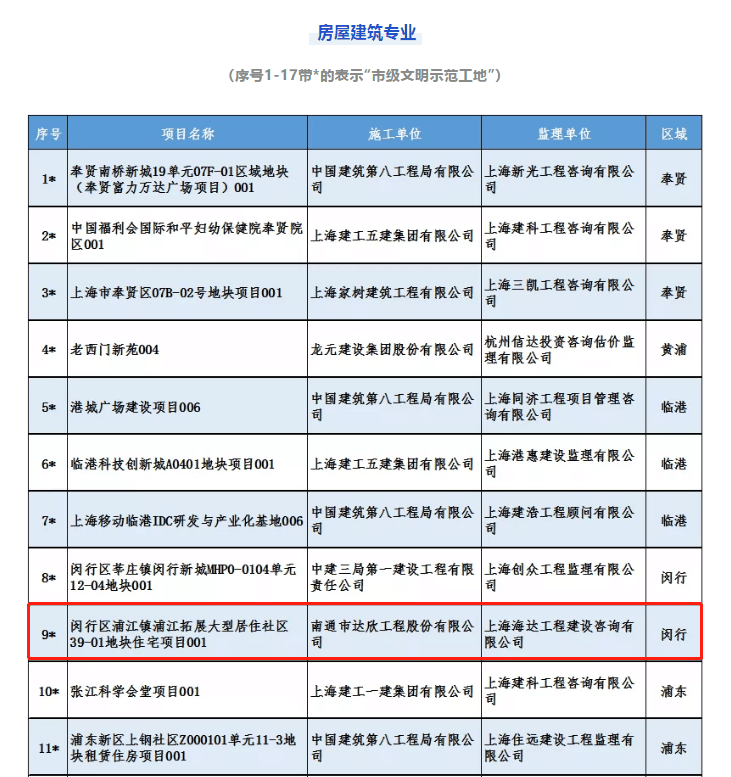 近日,上海住房城鄉(xiāng)建設(shè)管理委員會滬建質(zhì)安〔2021〕258號文件公布了《關(guān)于2020年度上海市文明工地的通知》。第一工程公司上海閔行區(qū)浦江鎮(zhèn)39-01地塊住宅項(xiàng)目被評為2020年度上海市文明示范工地。
