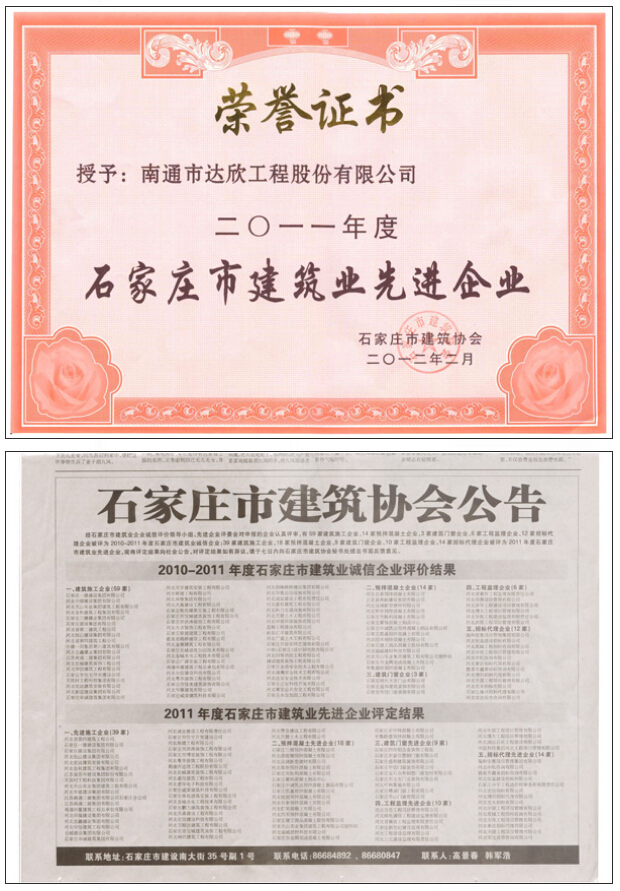 大會(huì)對(duì)2011年度石家莊市建筑業(yè)先進(jìn)企業(yè)和個(gè)人進(jìn)行了表彰。第四工程公司獲得多項(xiàng)榮譽(yù),并受到通報(bào)表彰(2月14日石家莊日?qǐng)?bào))。南通市達(dá)欣工程股份有限公司榮獲2011年度石家莊市先進(jìn)企業(yè);工程公司經(jīng)理?xiàng)铎o榮獲2011年度石家莊市建筑業(yè)優(yōu)秀經(jīng)理稱號(hào);傅海榮榮獲2011年度石家莊市建筑業(yè)優(yōu)秀總工程師稱號(hào);徐義忠、吉祥榮獲2011年度石家莊市建筑業(yè)優(yōu)秀項(xiàng)目經(jīng)理。
