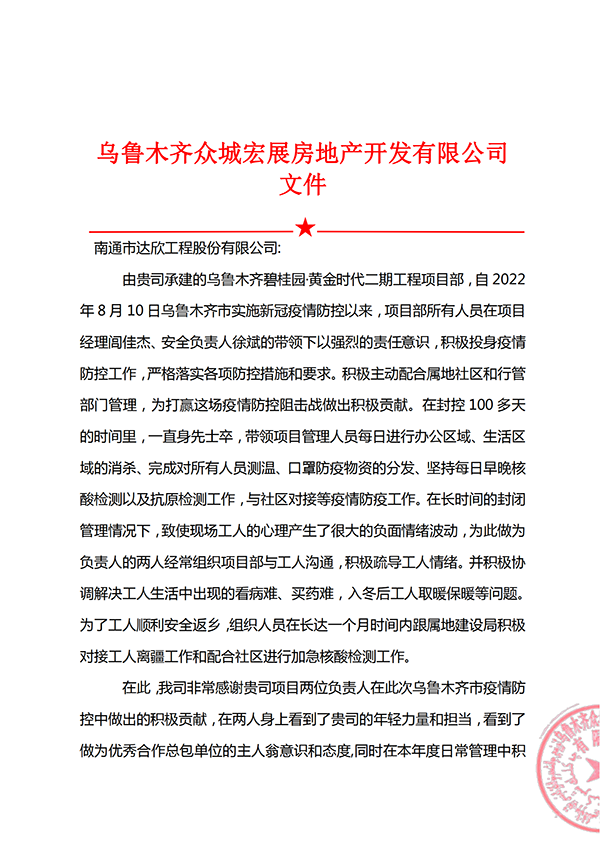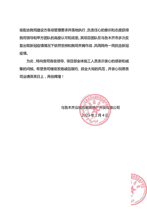 1月10日,集團(tuán)公司收到來自烏魯木齊眾城宏展房地產(chǎn)開發(fā)有限公司的一封表揚(yáng)信,信中對集團(tuán)第十一公司烏魯木齊碧桂園·黃金時代二期工程項目部,自2022年8月10日烏魯木齊市實施新冠疫情防控以來,項目部全體人員在疫情防控和項目建設(shè)中表現(xiàn)出的責(zé)任與擔(dān)當(dāng)表示感謝。內(nèi)容詳見附件: