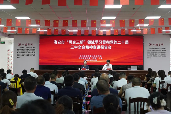 為全面深入學習宣傳貫徹黨的二十屆三中全會精神,激發(fā)黨員干事創(chuàng)業(yè)的熱情,9月11日,集團黨委以海安市召開的“兩企三新”領(lǐng)域?qū)W習貫徹黨的二十屆三中全會精神宣講報告會為契機組織黨員集中學習,集團副董事長、總經(jīng)理王邦國,黨委副書記、副董事長、紀委書記楊靜以及集團在海黨員參與線下現(xiàn)場教學,各駐外黨支部黨員以視頻會議的形式進行遠程參學。