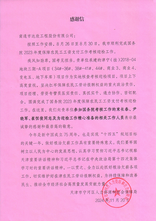 近日,第六工程公司承建的津?qū)帲⊕欤?018-04地塊項目三期工程代表天津市參加2023年度國家級省際交叉核查,在國務院針對省級根治欠薪工作整體情況的檢查中成績優(yōu)異,榮獲“標桿項目”榮譽稱號,并對迎檢過程中全體工作人員真抓實干、通力協(xié)作的精神表示感謝。