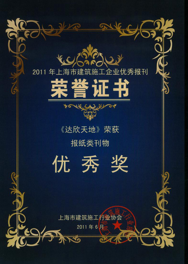 2011年上海市建筑施工企業(yè)優(yōu)秀報(bào)刊及協(xié)會(huì)優(yōu)秀通訊員表彰會(huì)日前召開(kāi),由上海市建筑施工企業(yè)優(yōu)秀報(bào)刊評(píng)委會(huì)評(píng)選,公司創(chuàng)辦的“達(dá)欣天地”報(bào)榮獲2011年上海市建筑施工企業(yè)優(yōu)秀報(bào)刊獎(jiǎng)。