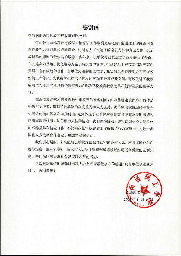集團(tuán)近日收到南通理工學(xué)院的感謝信,對(duì)其在本科教育教學(xué)審核評(píng)估中的大力支持表示誠(chéng)摯感謝。