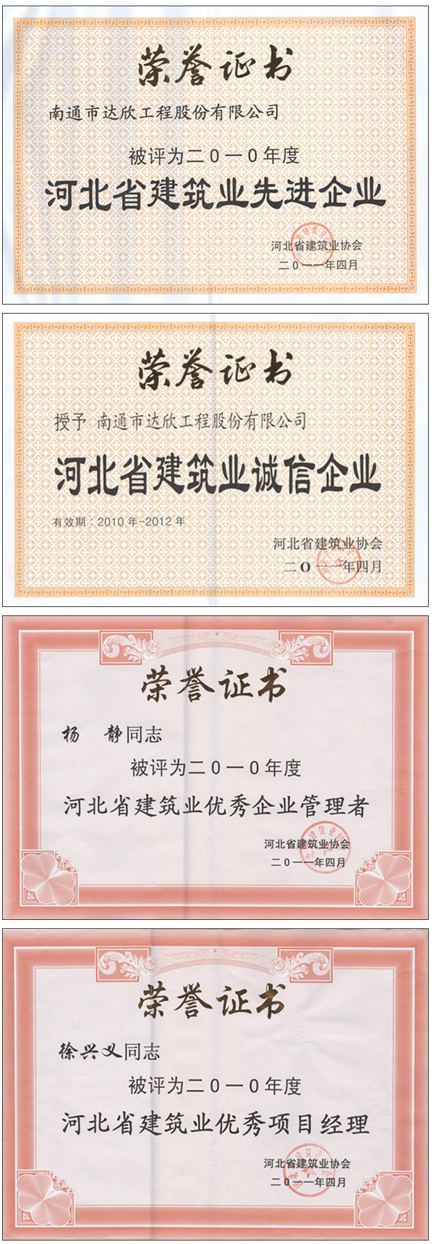 大會對第四工程公司承建的國優(yōu)工程石家莊中華商務廣場、南通市達欣工程股份有限公司榮獲的全國優(yōu)秀工程建設QC小組活動企業(yè)進行了通報表揚。同時對71家2010年度河北省建筑業(yè)誠信企業(yè)(江蘇省在冀施工企業(yè)僅2家)、106家河北省建筑業(yè)先進企業(yè)(江蘇省在冀施工企業(yè)僅3家)、優(yōu)秀企業(yè)管理者和優(yōu)秀項目經理進行了表彰和頒獎。
