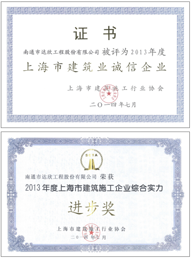 8月初,上海市建筑施工行業(yè)協(xié)會(huì)授予南通市達(dá)欣工程股份公司2013年度“上海市建筑業(yè)誠(chéng)信企業(yè)”榮譽(yù)稱號(hào),這是公司連續(xù)7年獲此殊榮,體現(xiàn)了上海市建設(shè)主管部門及業(yè)界對(duì)達(dá)欣品牌信譽(yù)的充分肯定。