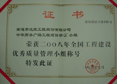 2008年7月6日,由中國建筑業(yè)協(xié)會(huì)組織的2008年度全國工程建設(shè)優(yōu)秀質(zhì)量管理(QC)小組活動(dòng)成果發(fā)布會(huì)在廣西桂林落下帷幕,我公司中華商務(wù)廣場工程項(xiàng)目部QC小組作為河北省推薦的十二個(gè)省級QC小組之一參加了會(huì)議并榮獲全國工程建設(shè)優(yōu)秀QC小組。這是我公司以“達(dá)欣”品牌獲得的第一項(xiàng)國家級 QC成果獎(jiǎng)。