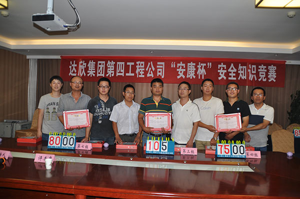 各項(xiàng)目部在建筑物上懸掛安全生產(chǎn)宣傳標(biāo)語(yǔ)24條幅;組織廣大職工觀看建筑施工中的事故案例,結(jié)合施工過(guò)程中的實(shí)際情況進(jìn)行分析點(diǎn)評(píng);對(duì)全體職工進(jìn)行了血壓檢測(cè);舉行了“安全生產(chǎn)月”主題簽名活動(dòng)。工程公司于6月8、9日在留村項(xiàng)目部組織所有在崗管理人員進(jìn)行了安全知識(shí)培訓(xùn)。6月22日工程公司舉行了“安康杯”安全知識(shí)競(jìng)賽,24名選手分8組參賽。經(jīng)過(guò)必答題、搶答題、附加題3個(gè)環(huán)節(jié)的比拼,最終眾美綠都項(xiàng)目部以領(lǐng)先笫二名25分的優(yōu)勢(shì)獲得冠軍,拉斐小鎮(zhèn)、留村莊園A區(qū)分獲二、三名。通過(guò)以上活動(dòng)的開(kāi)展,進(jìn)一步提高了廣大職工的安全生產(chǎn)知識(shí)和安全意識(shí),確保安全生產(chǎn)。